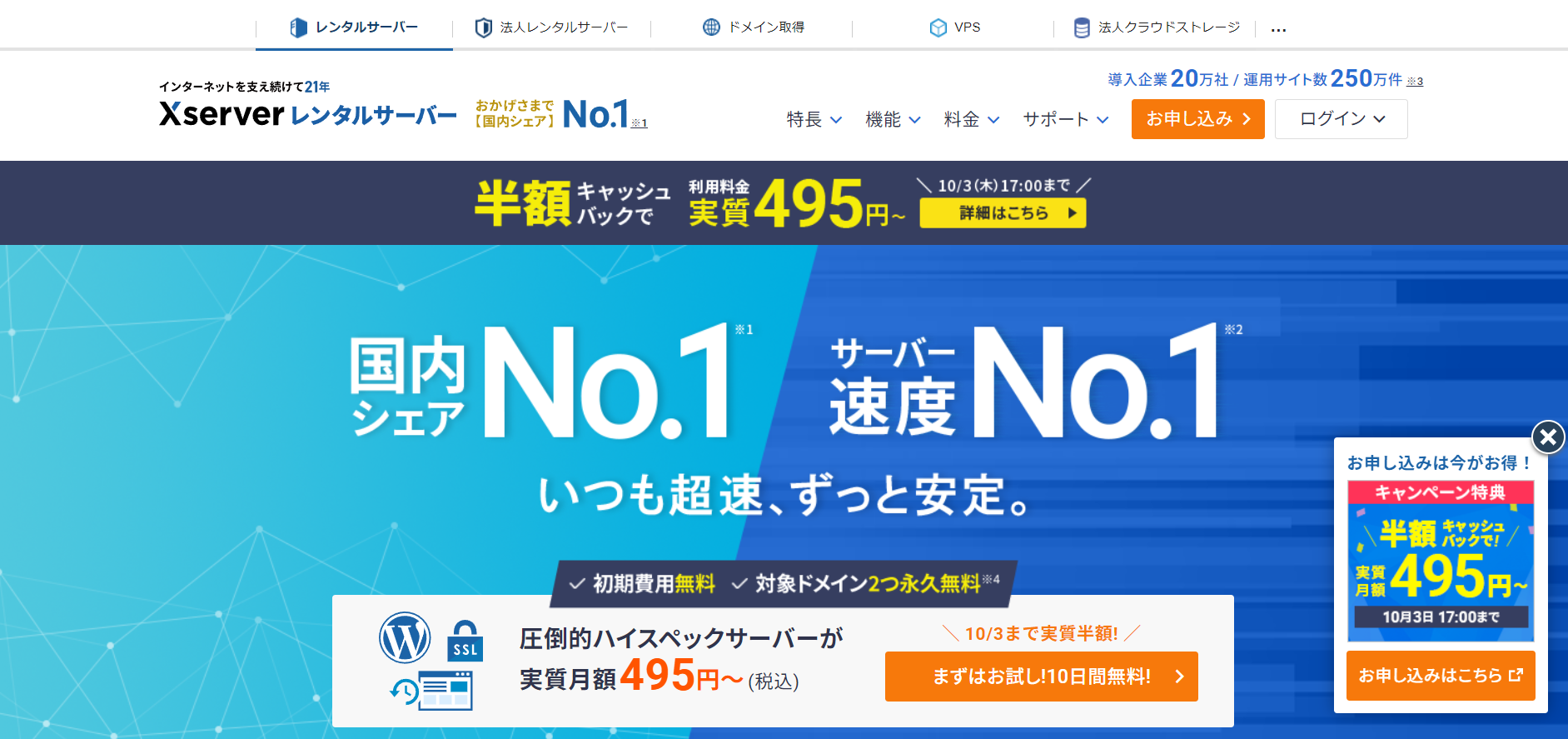 - 「エックスサーバー」は、運用サイト数230万件で国内シェアNo.1。